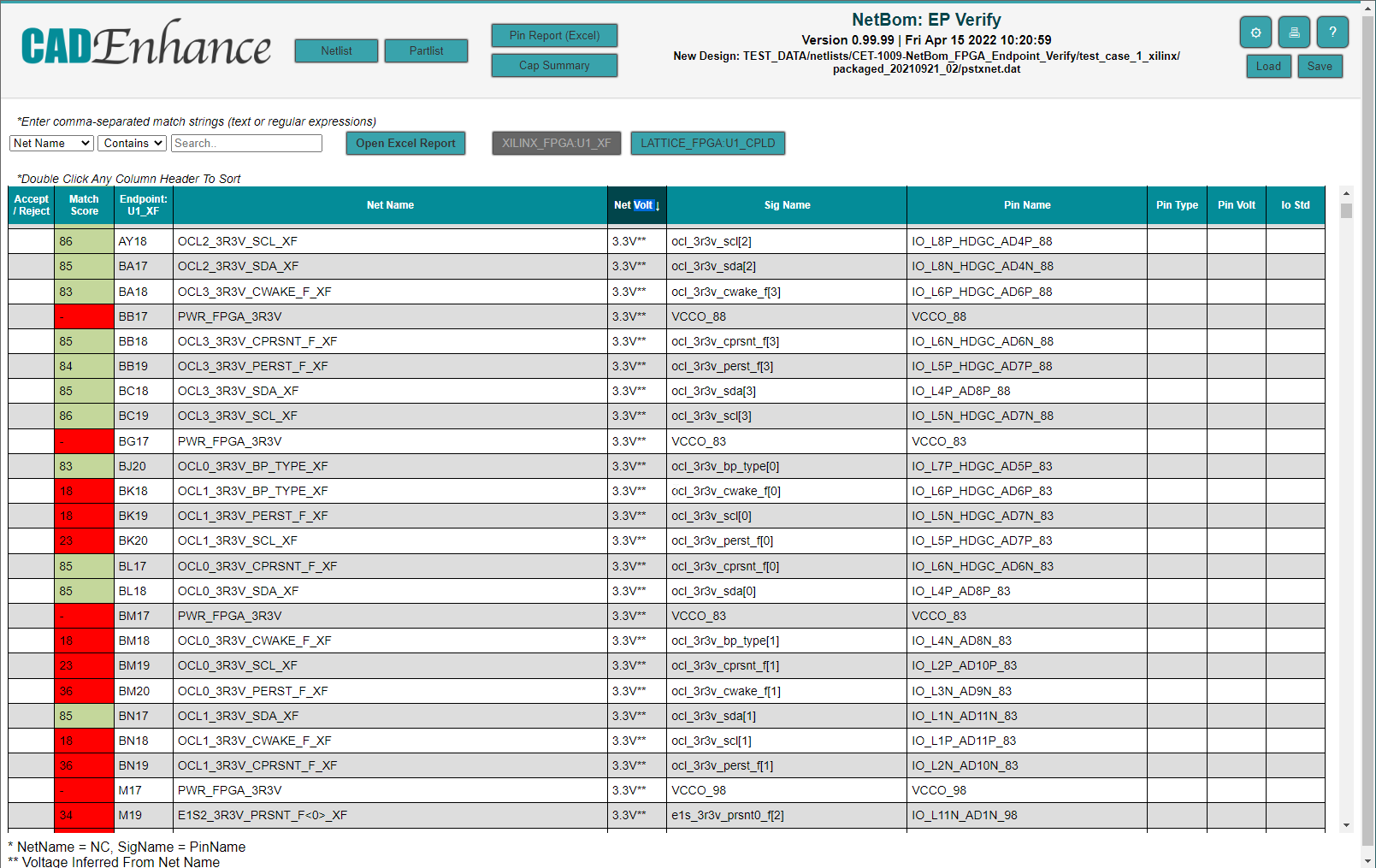 The Endpoint Verify Report is an interactive HTML page with a Tab for each Device and a row for each Device Pin. Fuzzy Logic is used to score the Net Name to Pin Name match. Powerful filtering and sorting enable quick focused validation